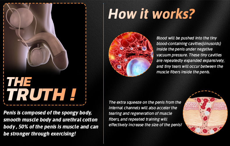 Watch your dick grow in the long clear chamber! You will be amazed by the increased size and the ultra-hardness! Transparent cylinder bridges a black handle with a powerful motor embedded and an ultra stretchy TPE sleeve which is heavily textured inside. Exciting folds, bumps and threads are squeezing and hitting your cock while the 6 level suctions contribute their power. More fascinating sucking biting than ever before! More importantly, your long-standing desire for conquering penis performance will be fulfilled. To start your pleasure journey, long press the power button to start, and press the button to switch the sucking level. To prevent excessive sucking, there is a button specially designed to relieve the pressure inside the cylinder. Your swollen shaft will be strongly appreciated!