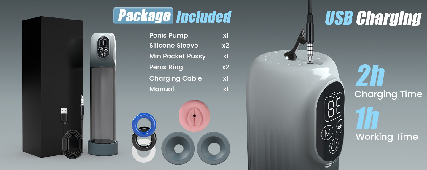 Penis Pump x1, Silicone Sleeve x2, Min Pocket Pussy x1, Penis Ring x3, Charging Cable x1, Manual x1